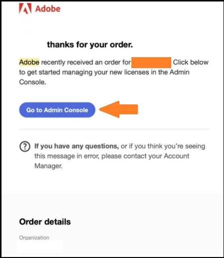 - Quando o cliente recebe um novo contrato, ele recebe um e-mail com um link para acessar o Admin Console. Copie o link de "Go To Admin Console" e cole em uma guia anônima ou acesse diretamente Admin Console pelo portal principal da empresa, usando suas credenciais.