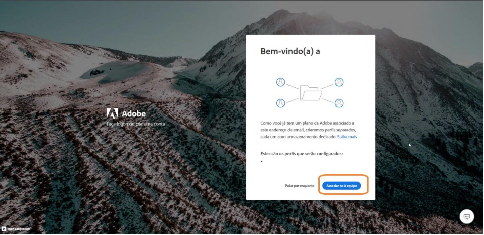 - Ao efetuar o login com a conta que recebeu o convite, será exibida a mensagem de “Bem vindo(a)”, selecione a opção “Associar-se à equipe”. Desta forma o usuário será solicitado a “aceitar os termos e condições” deste novo contrato: